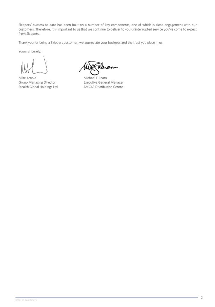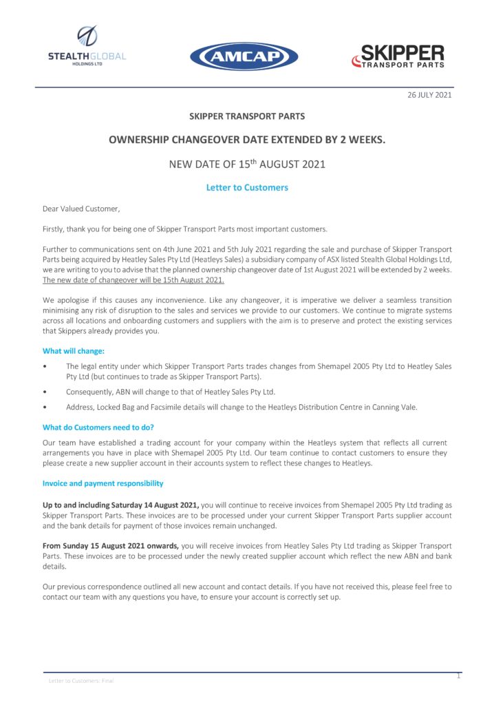 Update on the sale and purchase of Skipper Transport Parts by Heatley Sales Pty Ltd a subsidiary of ASX listed Stealth Global Holdings Ltd.